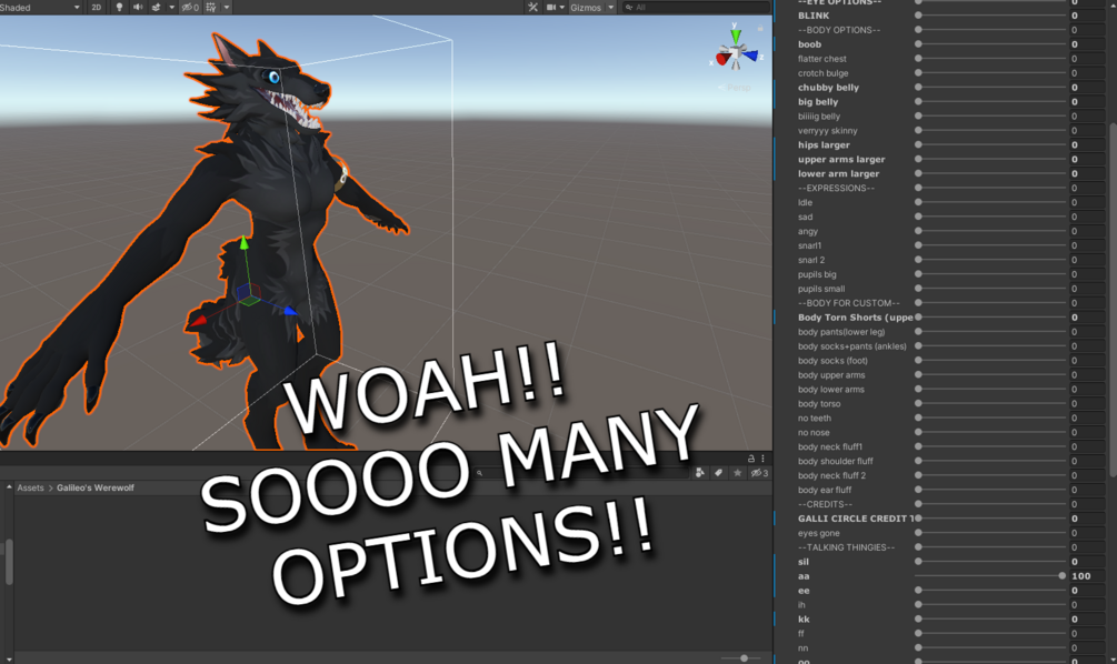 -Blendshapes+animations to take off shorts, to add/fit on custom clothes, female+male chest, different body types and sliders that make your wolf thiccer or thinner, expressions, mouth and eye blendshapes, physics, and blendshapes to disable the fluff, nose, eyes, teeth and more for more customization!