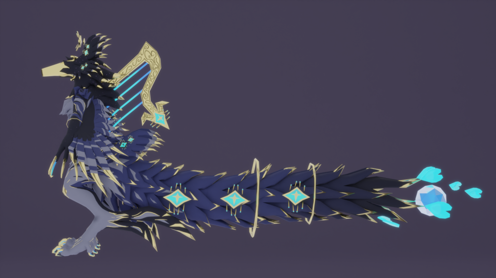 To clarify, it was NOT based on anything specific aside for dinosaurs, biblically accurate angels, harps (which is the instrument I play!), knights, and love as well as dreamy things! This is a colour scheme I've used on a few of my personal models/textures and I'd love to share it! I love these colours so much and would love to put them into more of my dreamy or cosmic models! There may be some armour I will make for it down the road as well!